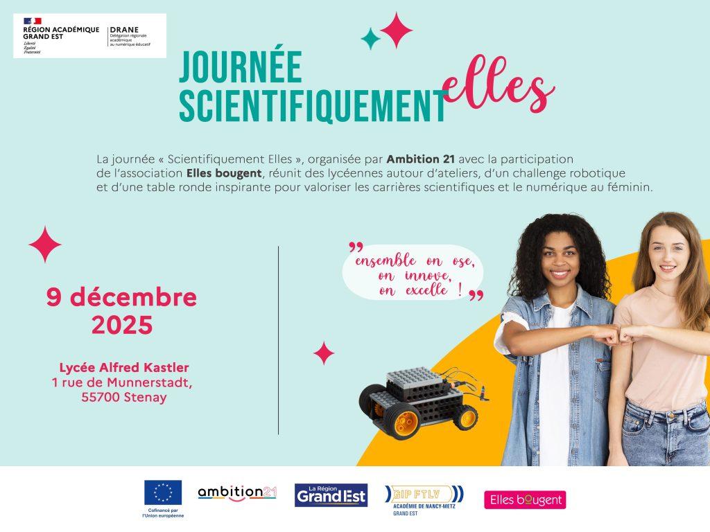 Le 9 décembre 2025, le Lycée Alfred Kastler de Stenay accueillera la première édition de la journée« Scientifiquement Elles », un événement dédié à la valorisation des filières scientifiques et technologiques auprès des jeunes filles. Portée par Ambition 21, cette initiative s’inscrit pleinement dans une démarche de promotion de l’égalité des chances et de lutte contre les stéréotypes de genre encore présents dans les domaines scientifiques et techniques.